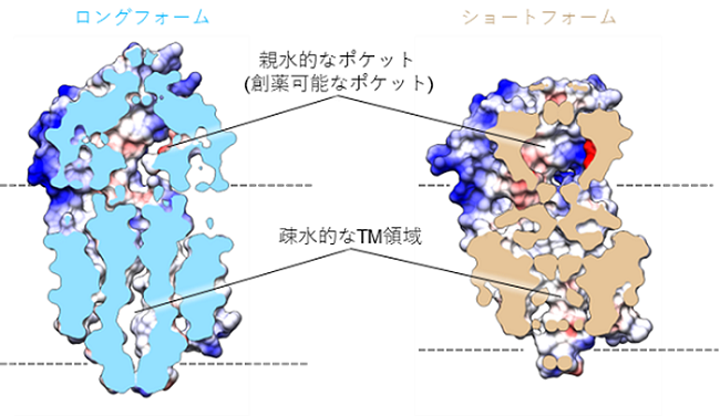 Mタンパク質の二量体界面には、二つのBDの間に形成される親水的なポケットが存在する。一方で、TM領域で疎水的な相互作用により閉じている。BDによって形成される親水的なポケットは薬物標的部位となる可能性がある。