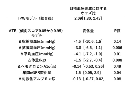 本研究では2群間の背景を調整するため、傾向スコアを用いた6パターンの重み付け(IPW)方法を実施しました。その結果、主要アウトカムである血圧管理<130/80mmHg>目標達成に関してはSGLT2阻害薬にて有意に高く、統合されたオッズ比は2.09【95%信頼区間1.80, 2.43】でした。さらに最も2群間の標準差違*5の少なかったATEモデル(傾向スコア0.05から0.95症例のみを抽出)において一般化線形モデルにて解析を行ったところ、SGLT2阻害薬治療群では、GLP1受容体アゴニスト治療群と比べ、拡張期血圧・平均血圧・体重はより低下し、年間の推算糸球体濾過量(eGFR)の変化量は有意に高値を示しました(図2)。