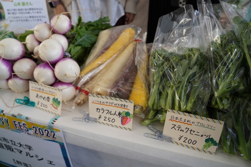 当日は、天気にも恵まれ、マルシェには多くの店舗ブースが立ち並ぶ中、市大生は市内の農家さんが育てた野菜を直販するブースを出店しました。
