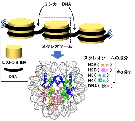図1 クロマチン構造の一部とヌクレオソームのコア構造