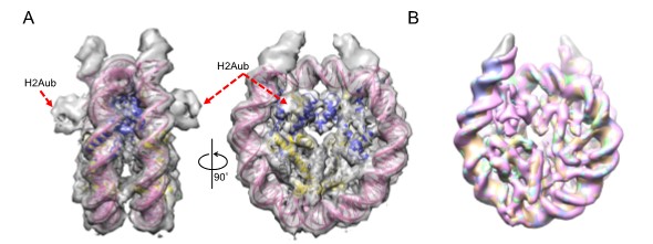 図3のAに示した構造は、たまたまユビキチン分子が見えた構造でH2Aubと書いた部分がユビキチン分子ですが、ほとんどのCryo-EM構造では図3のBで示すように恐らくユビキチン分子が揺らいでいるため、見えていません。いずれにしてもコアの構造は変化していなくてヒストンテールは見えていません。
