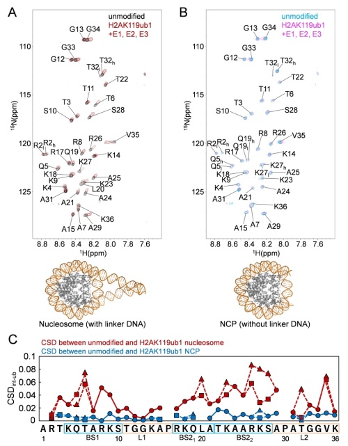 図4.H2AのC末テールのユビキチン化によるH3のN末テールのNMRシグナル変化 A:ヌクレオソームとユビキチン化ヌクレオソームのNMRシグナルの変化、B:NCPとユビキチン化NCPのNMRのシグナル変化は殆ど見られない。、C:ヌクレオソームとユビキチン化ヌクレオソームのシグナル変化の大きさ(赤)をH3テールのアミノ酸毎に示し、NCPとユビキチン化NCPのシグナル変化の大きさ(青)との比較