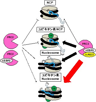 今回は新たに遺伝子が抑制される機構の一つを解明しました。細胞の運命を決定する時にポリコーム抑制複合体がヌクレオソームに結合し遺伝子の発現を抑制します。ポリコーム抑制複合体にはPRC1とPRC2の2種類が存在します。PRC1はヒストンH2AのC末テールをユビキチン化し、PRC2はヒストンH3のN末テールをメチル化します。この両者の動的な協調関係は今まで不明でした。