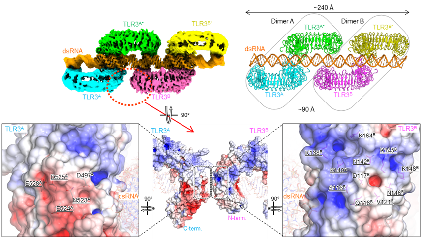 TLR3 は、リソソーム[注 3]に局在し、主としてウイルスに由来する二本鎖 RNA (double-stranded RNA、 dsRNA) を認識する。これまでの研究により、最短でおよそ 40 塩基対 のdsRNA を介して二量体を形成することが明らかにされている。また、より長鎖の dsRNA によ って、活性化が増強されることが示されているが、その機構については不明な点が多かった。