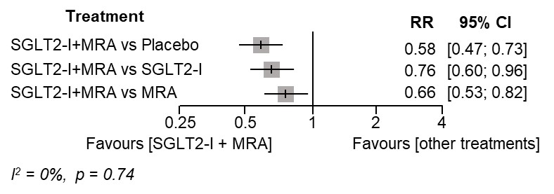サブグループ解析のデータを含む8つの研究で36,186人の患者を対象としました。CKD合併のT2DM患者において、SGLT2-IおよびMRAの単独使用はプラセボと比較して心血管(心血管死、心筋梗塞、心不全入院などの複合)イベントのリスクをそれぞれ有意に低下させました。さらに、2剤の併用療法はプラセボだけでなく、各薬剤の単独使用と比較しても心血管疾患のリスクを有意に低下させることが分かりました(RR [95%CI]:vs プラセボ 0.58 [0.47-0.73]、vs SGLT2-I 0.76 [0.60-0.96]、vs MRA 0.66 [0.53-0.82])(図1)。腎イベント(腎不全への進展、ベースラインから40%以上のeGFR低下、顕性アルブミン尿への進展、腎死)に関しても、SGLT2-I、MRAおよび両者の併用療法はプラセボと比較して有意にリスクを低下させました。しかし、各薬剤の単独使用と比較して差を認めませんでした。また、MRAの単独使用はプラセボと比較して高カリウム血症のリスクを上昇させましたが、2剤の併用は高カリウム血症のリスクを低下させることが分かりました。