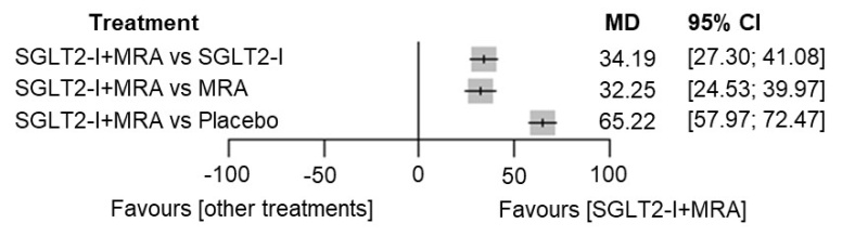 アルブミン尿については、17個の研究から34,412人の患者を対象としました。SGLT2-IとMRAの組み合わせは、各薬剤の単独使用およびプラセボと比較して、アルブミン尿を有意に減少させました(MD[95%CI]:それぞれ34.19[27.30; 41.08]、32.25[24.53; 39.97]、および65.22[57.97; 72.47])(図2)。また、両薬剤の組み合わせは、各薬剤の単独使用およびプラセボと比較して、収縮期血圧の降圧効果が最も大きいことも明らかとなりました。