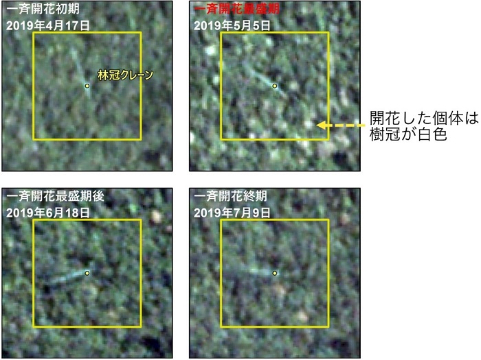 2019年4月から5月にかけてランビルヒルズ国立公園で一斉開花が生じ(図2)、その様子の変化は林冠クレーンからの目視観測と同クレーンに設置したタイムラプスカメラを用いて撮影した画像により記録されました(図3)。同時期のPlanetScope衛星により観測されたRGB(赤バンド・緑バンド・青バンド)合成画像を確認すると、クレーン周辺の森林調査区において緑色から白色に変わる地点が確認できました。白色に変化した地点と樹木個体の位置情報を照らし合わせると、それらが開花したフタバガキ科のリュウノウジュ(Dryobalanops属)やサラノキ(Shorea属)、ウルシ科(Swintonia属)、シナノキ科(Pentace属)の中で特に明るい花色を持つ樹種であることが分かりました。また同年6月には樹冠が赤色に変化したフタバガキ科の個体が見つかり、その様子もPlanetScope衛星により観測されたRGB合成画像で確認されました(図4)。