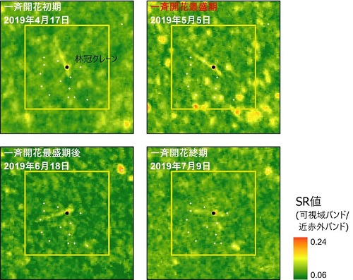 PlanetScope衛星により観測されたRGB合成画像から確認できた個体を対象に開花前後における分光データの特徴を詳しく調べると、可視赤バンドと近赤外バンドの割合から求められるsimple ratio vegetation index (SR)値が統計的に有意に上昇していることがわかりました(図5)。この事実は、白色や赤色などの明るい樹冠の色変化については、3-4mの空間解像度を持つ光学センサーを搭載した衛星により検出できることを示しました。