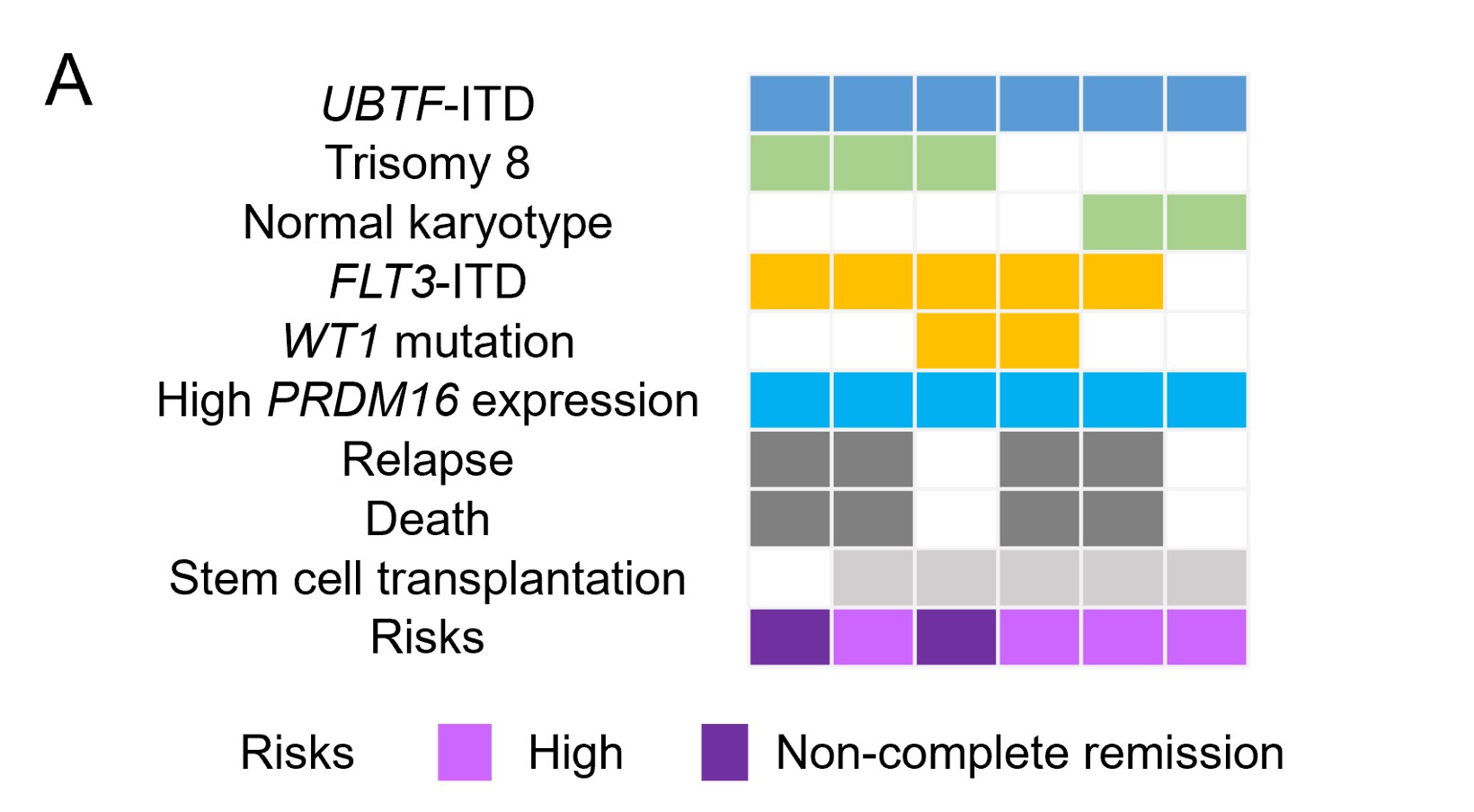 UBTF-ITDを有する6症例を6列に示している。8トリソミー、FLT3-ITD、WT1遺伝子変異、PRDM16遺伝子高発現との合併を多く認めた。