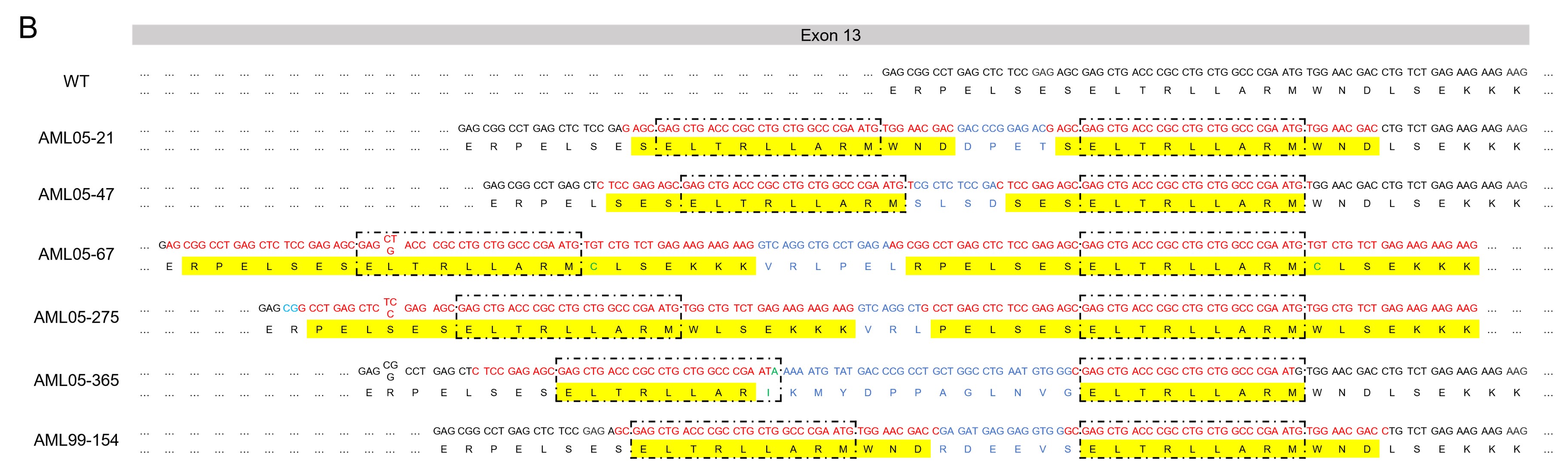 各症例で同定されたUBTF-ITDの遺伝子配列を示している。各症例の上段は塩基配列、下段はアミノ酸配列を示している。いずれもExon 13内に重複を認め(黄色部分)、全症例に共通した重複配列(点線四角)を有していた。