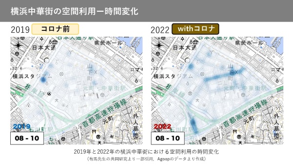 概要:横浜や中華街の観光データについてX-Locations(クロスロケーションズ)という位置情報ビッグデータをAIで解析して人流データを集計し、効果検証を実施。データから仮説を導き出して横浜中華街内の空間利⽤について提案する。