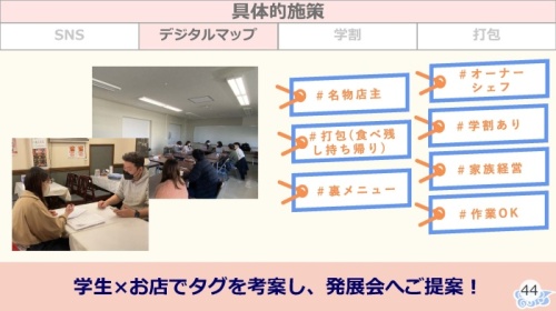 ターゲットに有益な情報を提供するためにデジタルマップの作成を提案。現状のマップは、細かすぎて分からず、行き先が決まっていないと使えないという問題があり、お店の方々と共に、お店のキーワード検索のための「タグ」を考案して、中華街発展会に提案して採用してもらいました。