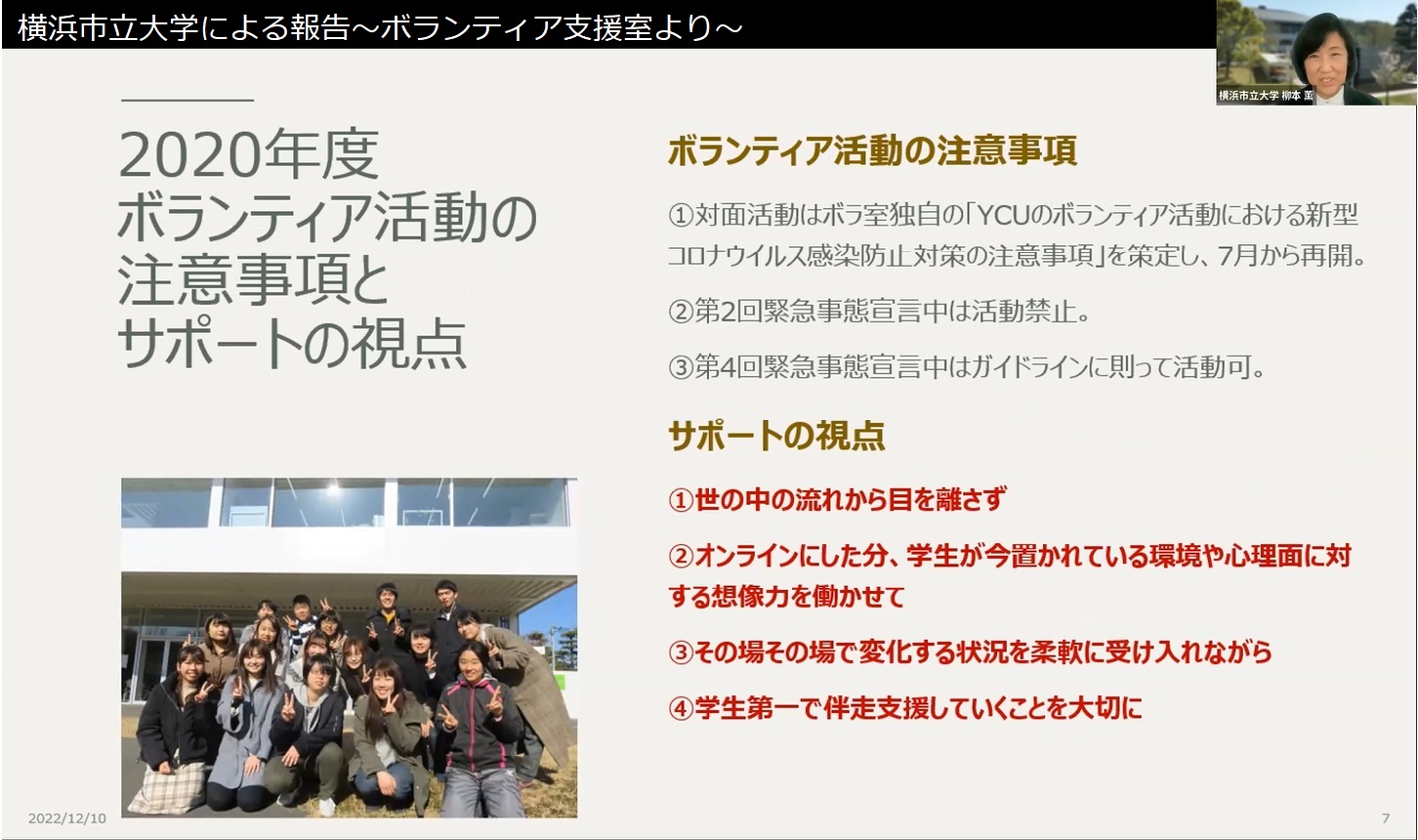 令和4年12月10日(土)に、オンライン(Zoom)にて、「新型コロナ禍の経験から、あらためて学生支援について考える—コロナ禍の学生生活と学修への影響—」をテーマとして「第8回ヨコハマFDフォーラム」を開催し、横浜4大学を含む全国から、教育機関の教職員・学生93名の参加がありました。