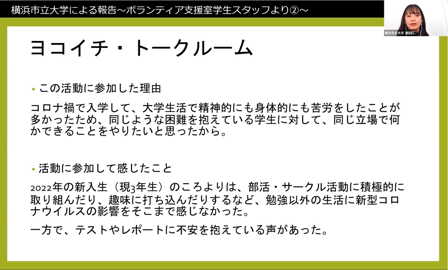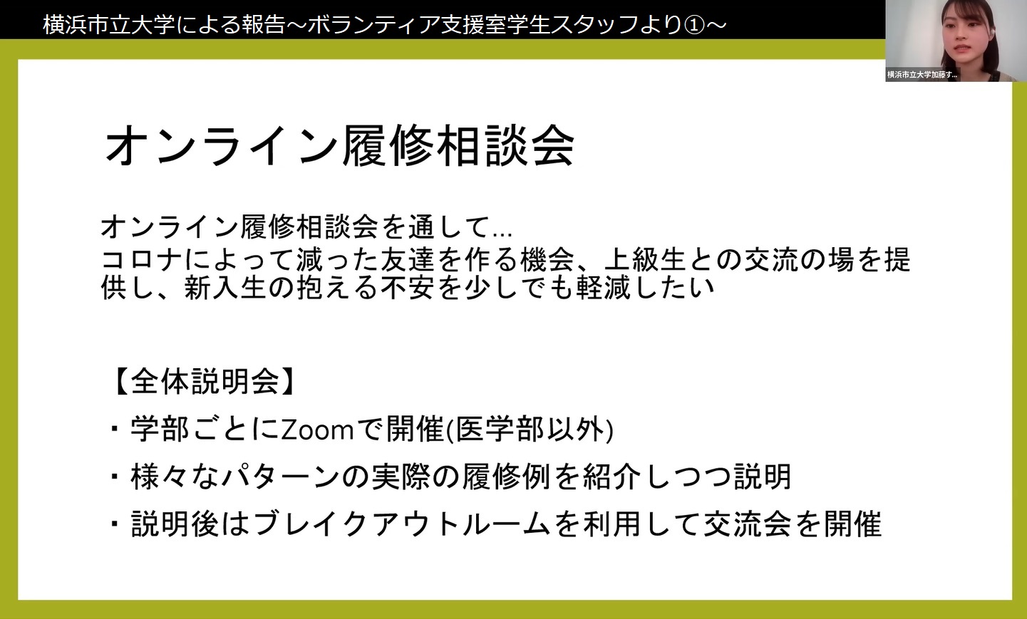 第1部では各大学の実践事例が報告され、教職員からは各大学のコロナ禍での学修・学生生活支援、学生からはコロナ禍の実体験や大学への意見等の発表があり、教職員・学生双方の視点からコロナ禍での各大学の実態を知ることができました。