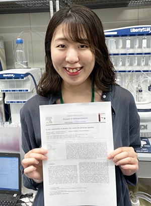本研究は、修士1年から一緒に研究を開始した藤田さんが1年足らずで纏め上げた成果になります。藤田さんは、研究室で行なってきたPPI阻害ペプチド開発にin silicoデザインという新しいアプローチを取り入れ、ペプチド合成、標的タンパク質の発現・精製、細胞評価、論文執筆までを一人で行ったスーパーウーマンです。