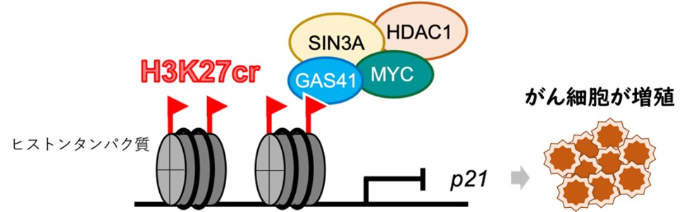 図1. ヒストンのクロトニル化修飾を起因とした大腸がん増殖機構のモデル図。ヒストンH3の27番目のリジンがクロトニル化修飾(H3K27cr)され、GAS41が結合する。GAS41はMYC、SIN3A、HDAC1と協働的に機能し、p21の転写を抑制する。この結果、細胞周期が正常に制御されず、がん細胞の分化が活性化してしまう。