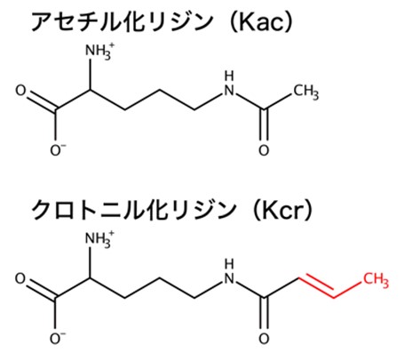 図2. アセチル化リジン(Kac)とクロトニル化リジン(Kcr)の化学構造。