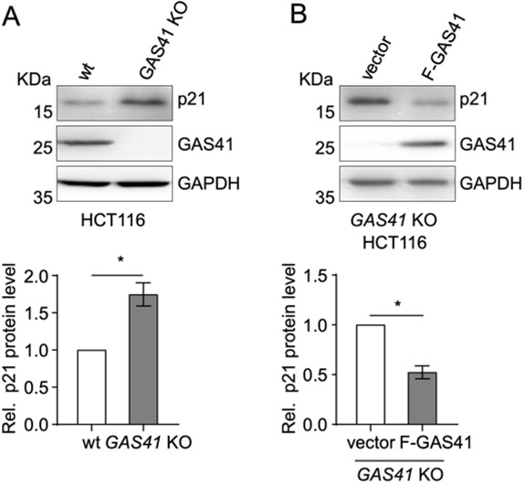 B, GAS41ノックアウトHCT116にGAS41をレスキューした後のp21とGAS41のウェスタンブロティング。*P < 0.05。