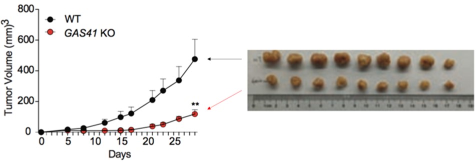 次にゼノグラフトマウスモデルを用いて、HCT116の細胞増殖におけるGAS41の必要性を評価しました。つまり免疫不全マウスの皮下にHCT116またはGAS41ノックアウトHCT116を移植し、一月後にそれらの大きさを比較しました。その結果、GAS41ノックアウトHCT116は非ノックアウトHCT116に比べて明らかに小さいことが分かりました(図4)。これらの結果から、GAS41がp21の転写を抑制し、HCT116の細胞分化が活性化していると考えられます。