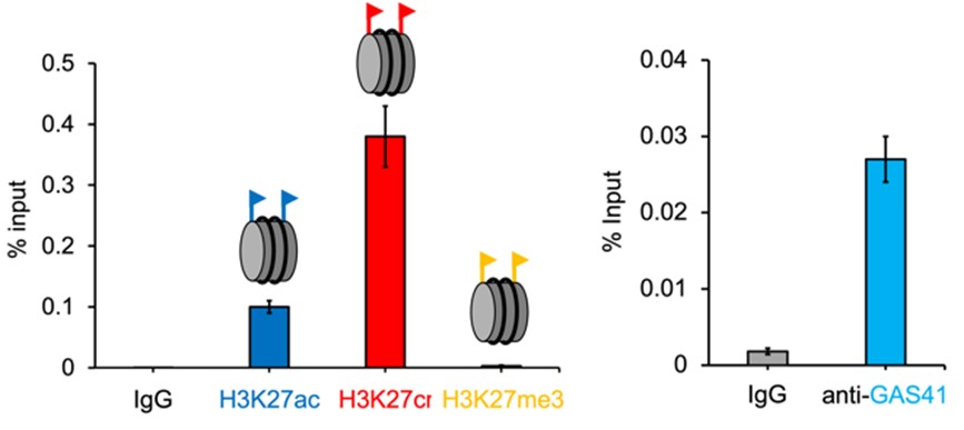 さらにGAS41も同領域に局在していることを発見しており、このことからGAS41がH3K27crに結合すると予想しました。