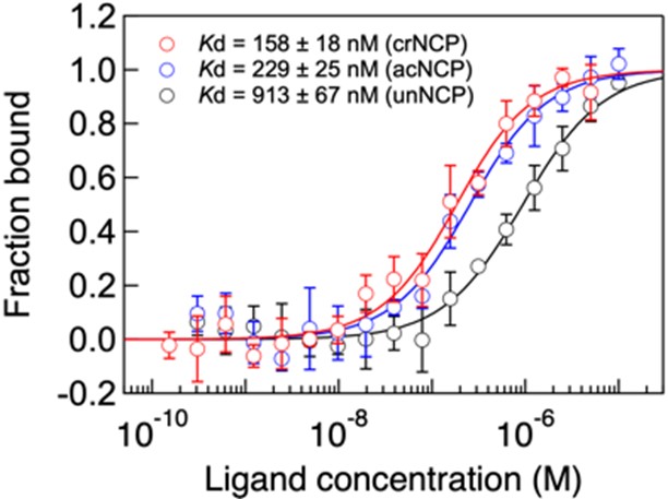 そこでGAS41とH3K27crの相互作用について定量的に評価するため、クロトニル化されたヌクレオソームコア粒子(crNCP)に対してGAS41の分子間相互作用解析(マイクロスケール熱泳動*6:MST(MicroScale Thermophoresis))を行いました。この際、アセチル化されたヌクレオソームコア粒子(acNCP)や修飾されていないヌクレオソームコア粒子(unNCP)に対しても同解析を行いました。その結果、GAS41はいずれのNCPに対しても結合すること、中でもcrNCPに対して最も強く結合することが明らかとなりました(図6)。