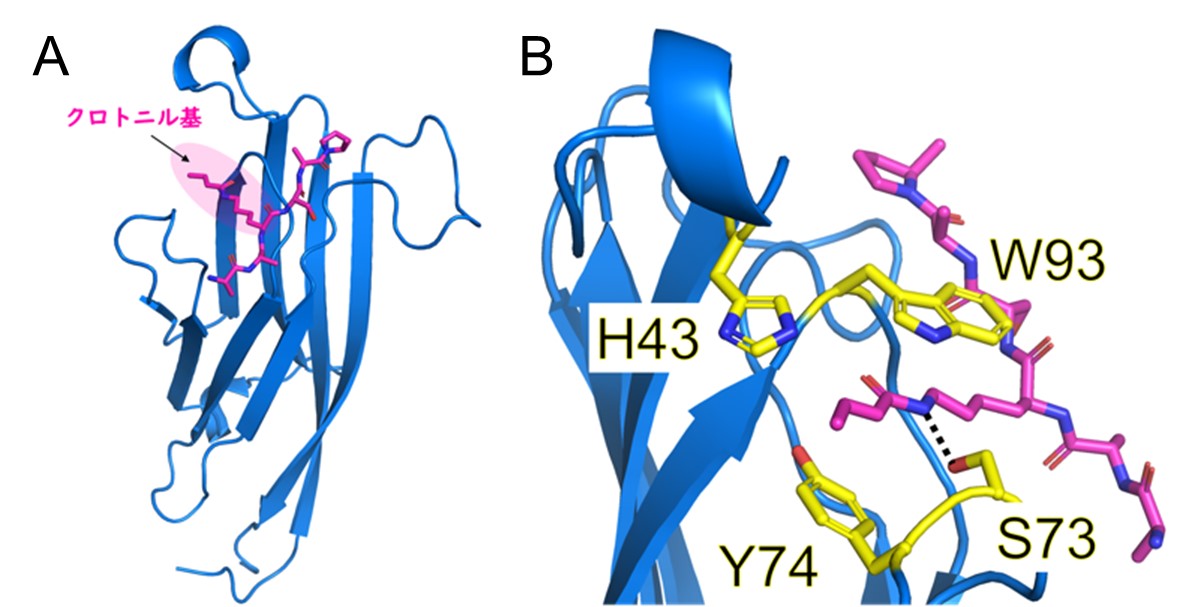 B, クロトニル基の認識に重要なアミノ酸残基(H43, S73, Y74, W93(黄))。