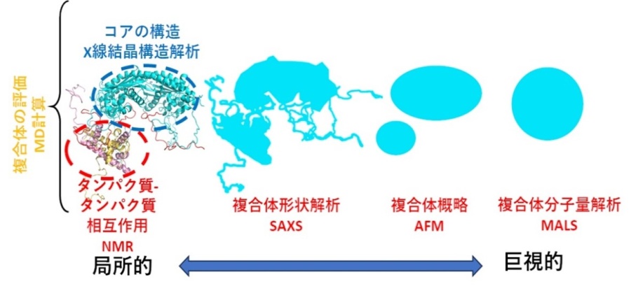 図:NMR、SAXS、MALS、AFM、MD計算と生化学実験など複数の解析手法を 組み合わせた統合的相関構造解析法の概要図