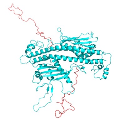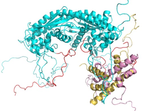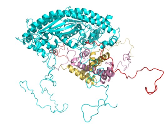 (図3)計算で得られたヒトNAP1の2量体構造。ヘッドホン型構造の上から見た図で上下に紐様のCTADが動的に揺らいでいる。