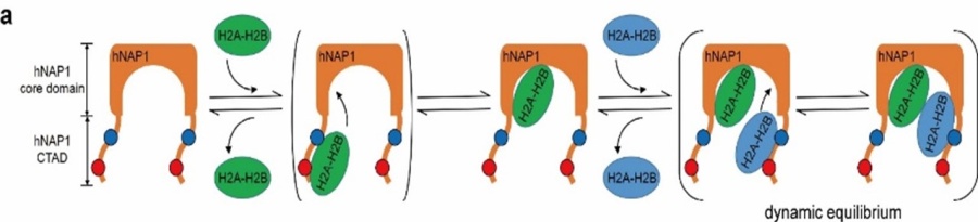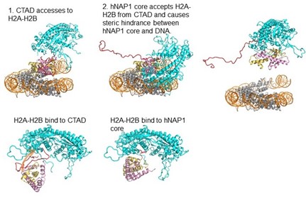 (図8)NAP1がヌクレオソームからH2AH2Bを乖離させるときの模式図。先ずNAP1のCTADがヌクレオソーム中のH2AH2Bにアクセスする。CTADはH2BのN末テイルとH2AのC末テイルと相互作用し、H2AH2Bのヌクレオソーム中での安定化を弱めてCTADの結合を強め次にH2AH2Bがヌクレオソームから解離すると同時にNAP1の溝のH2AH2Bを納める。