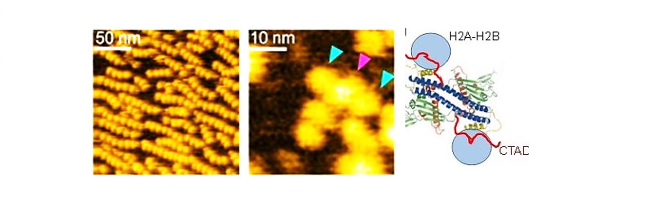 (図7)NAP1の原子間力顕微鏡(AFM)像。(左)NAP1だけのAFM像では棒状の多量体が形成されていた。(中)NAP1にH2A-H2Bが結合すると棒状構造が壊れ、NAP1の2量体にH2A-H2Bが結合したAFM像が得られる。(右)AFM像のモデル。