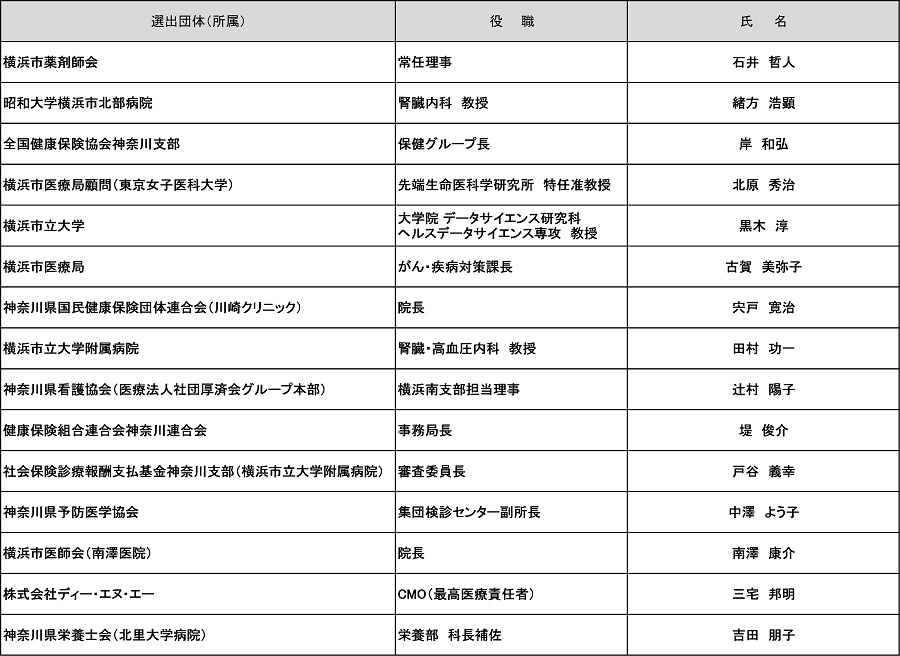 本協議会では、ヘルスデータに基づいてCKD関連データの可視化をはかることで、横浜のCKD患者の実態に迫り、重症化予防のための診療体制の構築や健保組合等と連携した積極的な受診勧奨実施、企業・産業医等に対する啓発に努めてまいります。ご指導とご協力につきまして、よろしくお願いいたします。