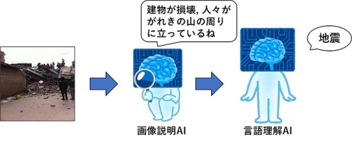 図1:標準的な画像認識システムは物体の色や形状から画像を認識する(上段)。本システムでは、画像説明AIの説明を聞いた言語理解AIが、画像を見ずにその内容を推論する(下段)。