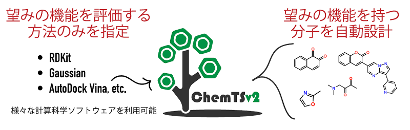 今回、この国際共同研究グループは、ユーザーが着目する分子の機能や分子設計条件の設定にのみ集中して分子設計AIの利用を可能とするPythonパッケージChemTSv2を開発し、無償で一般公開しました(図1)。ChemTSv2は様々な分子設計の需要に応えるため、高度な並列化技術も導入されており高速な分子設計を実施することも可能です。