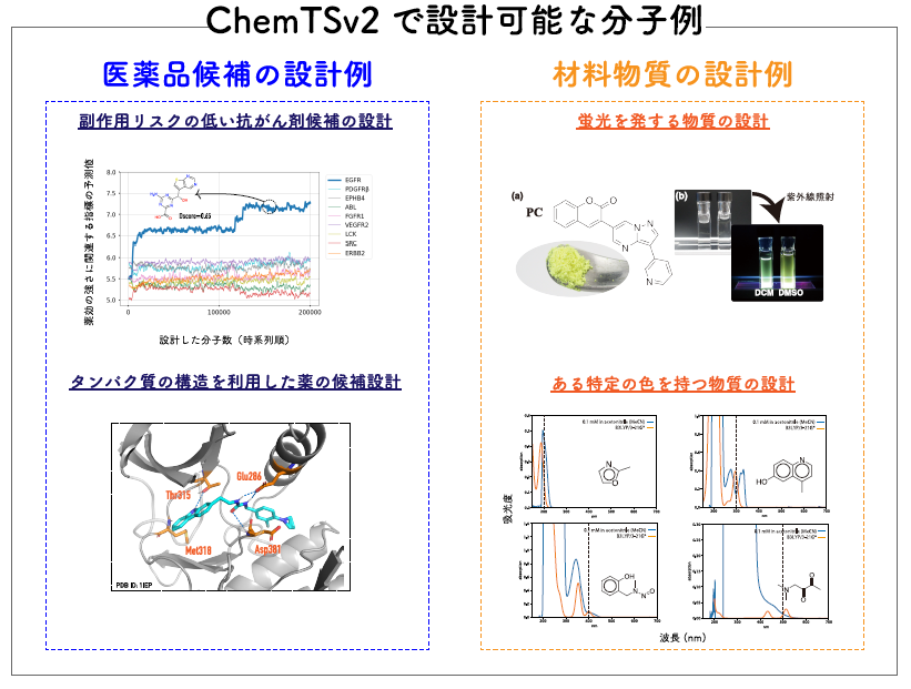 ChemTSv2で実際に設計可能な分子の例として、医薬品候補と材料物資を挙げています(図3)。これらの例は、これまでChemTSを用いて分子設計を試みてきたもので、医薬品候補の設計例に関しては、期待する機能を持つかどうかの確認は実験が必要です。一方、材料物質の設計に関しては、実験により期待する機能を持つ分子が設計できたことを実証しています。それぞれの分子設計例の詳細に関しては、元論文をご参照下さい。