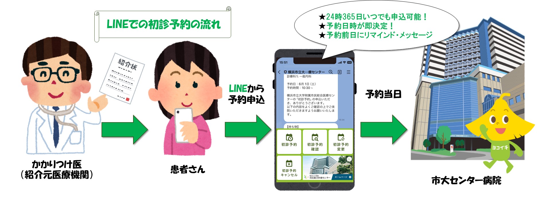 横浜市立大学附属市民総合医療センター(病院長:榊原 秀也,以下、横浜市大センター病院)は、コモン・クリエーション株式会社(本社:福岡県福岡市、CEO:留置 正浩)の予約システム「Med-well」*を採用し、従来のホームページからのWEB申込に代わって、「LINEを活用した初診予約システム」を新たに導入することとしました。