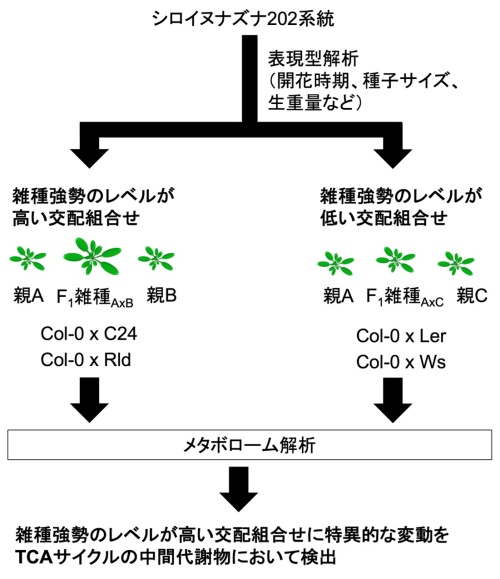 本研究では、モデル植物であるシロイヌナズナ202系統を材料に、開花時期、種子サイズ、種子発芽時期、発芽後15日目の生重量に関する表現型解析に基づいて、雑種強勢の表現型発現レベルごとにグループ分けをしました。雑種強勢の発現レベルが高い交配組み合わせと低い交配組み合わせを比較解析した結果、高いレベルの雑種強勢を示す交配組み合わせにおいては、特異的にTCAサイクル(ミトコンドリア内での炭素代謝回路)の中間代謝物の産生量が変化することを明らかにしました。