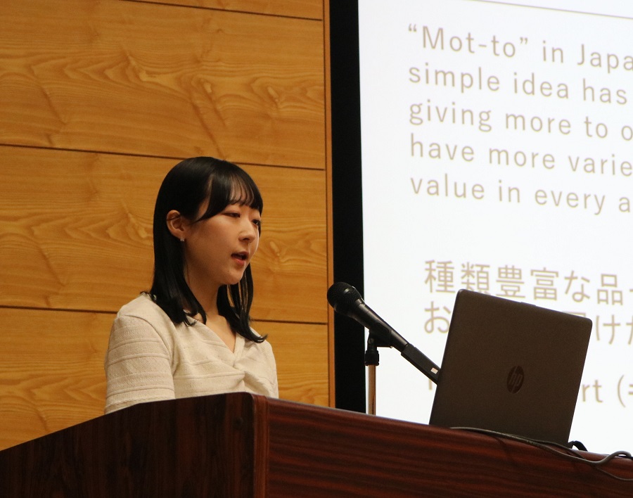 キャリア支援プログラムの参加体験談として、春休み期間中の4週間、オーストラリアでのマーケティングやオペレーションに関わる業務を行う海外インターンシップに参加した学生からの報告がありました。ビジネスで求められる英語力や、コミュニケーション力を学びたいという意欲をもって参加し、商品のプロモーションビデオの作成を任せてもらった体験が紹介されました。そこで、仕事に対する向き合い方やモチベーションの持ち方が人それぞれにあることを学び、自身がどのような職種で働きたいかをより深く考えることにつながり、将来の選択肢が広がる良い経験になったとのことでした。