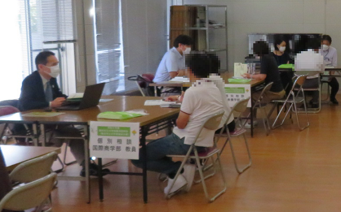 全体説明会に続き、国際教養学部、国際商学部、理学部、データサイエンス学部 国際総合科学部の学生のご家族を対象とした事前申込制の個別相談会を行いました。対象学部の各教員への相談ブースと、事務担当職員への「カリキュラム」、「留学」、「就職支援」、「経済支援」の相談内容に応じたブースを設け、21組の参加がありました。