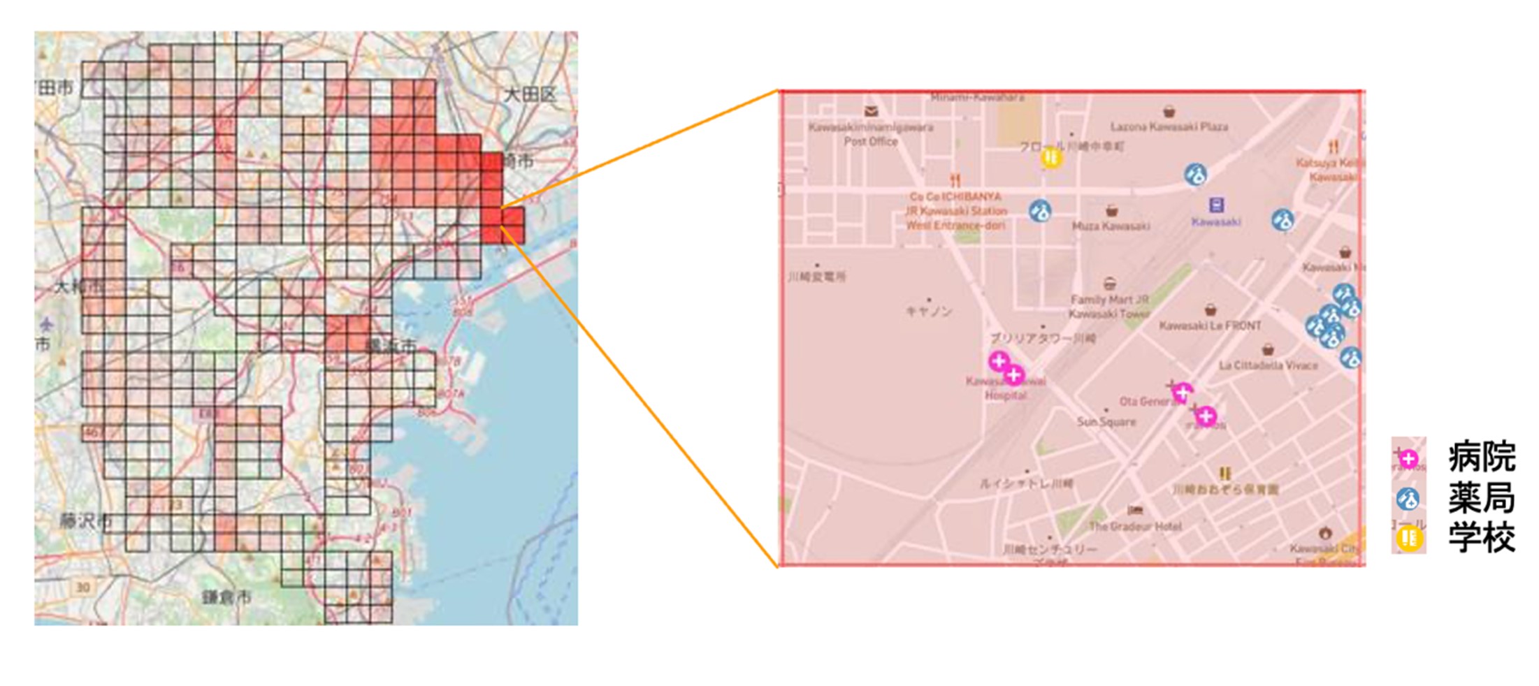 今回の論文では、今まで利活用されてこなかったハザードマップを利活用しやすい形で再提供することを目的とするアルゴリズム開発を主として研究を行いました。具体的には、ある地域(例:横浜市)を1km四方の短形に区切り、それぞれの短形内における特定の想定浸水深の割合を画像分析から取得、分析結果を通じ、割合が高ければ赤、低ければ無色で地図上に表示するシステムを開発しました。また、該当の場所について地図上に地物(例:学校/病院等)の場所を可視化することで、連結分析が可能であることを示しました。