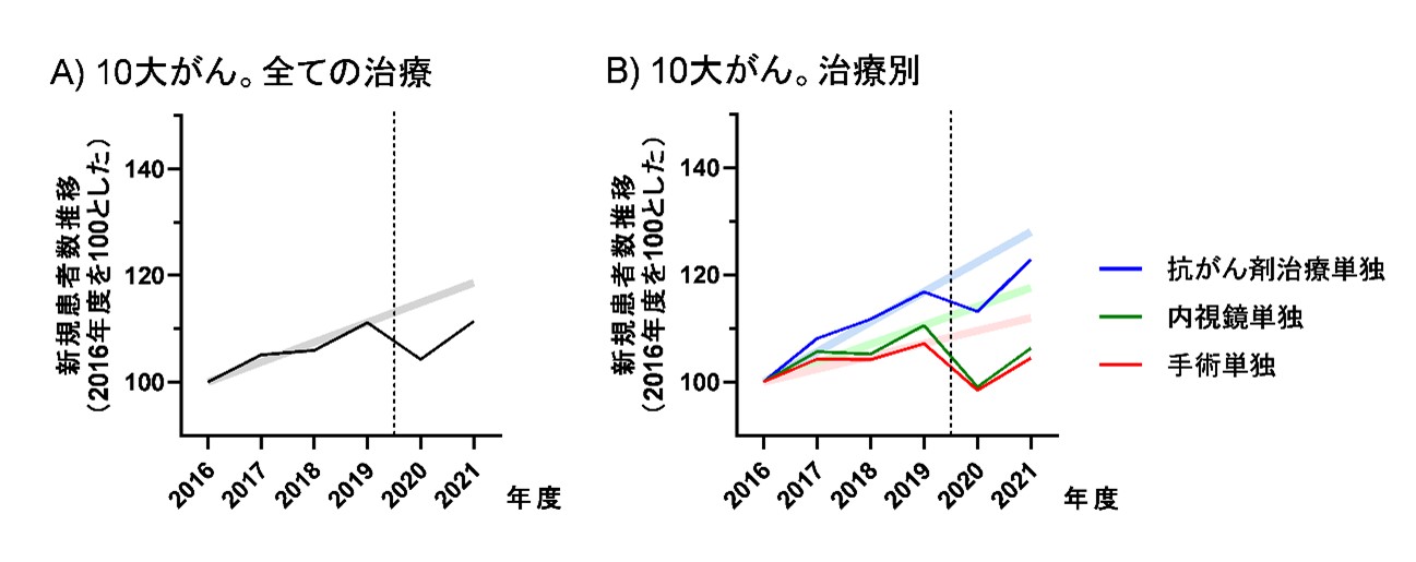 図1:新規患者数推移(A:10大がん全ての治療数の推移、B:10大がん治療別の推移)