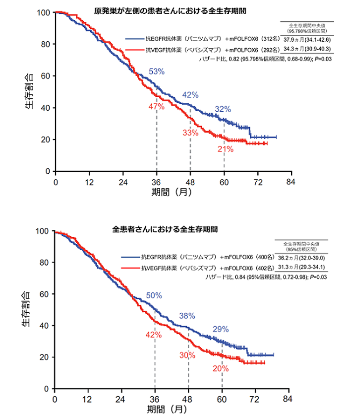 フォローアップ期間中央値5.1年において、主要評価項目である全生存期間は、原発巣が左側の患者さんにおいて、中央値はパニツムマブ群:37.9ヵ月、ベバシズマブ群:34.3ヵ月で、ハザード比*5:0.82 (95.798%信頼区間:0.68-0.99、P=0.03)と、統計学的に有意にパニツムマブ群で延長したことが示されました。また、生存割合は、無作為割り付け後の約28ヵ月時点以降からパニツムマブ群がベバシズマブ群を上回るように差が開いていきました(パニツムマブ群/ベバシズマブ群、3年生存割合:53%/47%、4年生存割合:42%/33%、5年生存割合:32%/21%)。さらに、全患者さんにおいても、全生存期間中央値はパニツムマブ群:36.2ヵ月、ベバシズマブ群:31.3ヵ月で、ハザード比:0.84 (95%信頼区間:0.72-0.98、P=0.03)と、統計学的に有意にパニツムマブ群で延長したことが示されました。