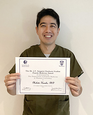 この賞はWestern大学で研究活動をしている家庭医の中で、研究に加えて診療実践・教育実践において顕著な業績があった方に対して贈られます。私は沖縄県の小離島において医師1人の離島診療所で勤務しながら、学習者の受け入れや離島診療所の研究ネットワークの立ち上げを行ったこと、横浜市の生活困窮地域にある医療機関と連携し診療を行いながら医療体制の充実や教育の提供を行った点を評価していただきました。