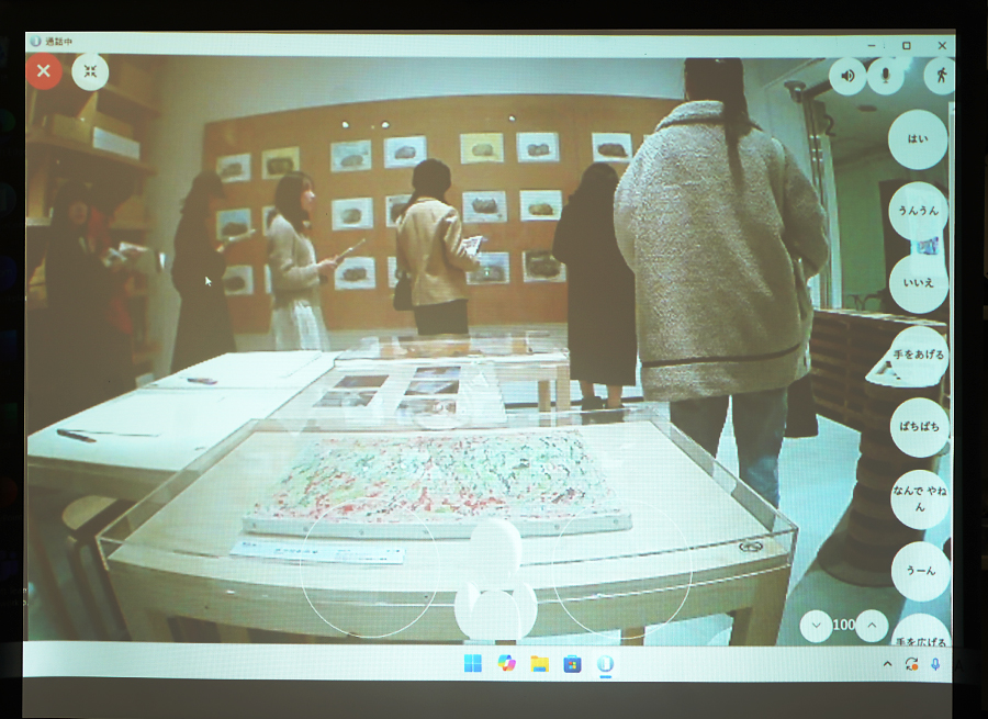 直接美術館に行くことができない学生は、大学のゼミ室に集まって、分身ロボット「OriHime」*1を操作して、遠隔(オンライン)で鑑賞する体験をしました。これは、インクルーシブアート、すなわち誰も排除しないアートのあり方を模索する試みでもありました。初めての試みだったので、慣れない「OriHime」の操作に戸惑ったり、ネットワークや音声に課題を感じたりする場面もありましたが、遠隔参加の新たな可能性を感じる機会となりました。特に、「ジェスチャーするたびに『かわいい』って褒めてもらえる。自分がペットかアバターに変身した気分で面白い」という感覚は、ロボットという「身体」を持ったからこその新鮮な体験でした。