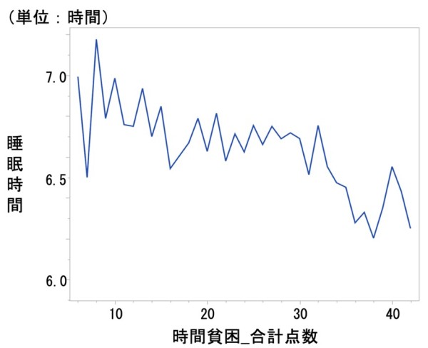 平日の睡眠時間が7時間を下回ると、時間貧困指標の合計点数 (6~42点)が高くなる(時間が足りないと強く感じる)傾向が確認されました。