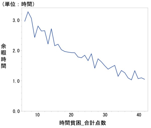 平日の余暇時間が3時間を下回ると、時間貧困指標の合計点数(6~42点)が高くなる(時間が足りないと強く感じる)傾向が確認されました。