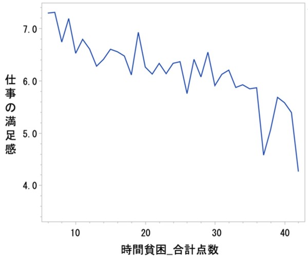 また、仕事の満足感についても同様に、時間貧困指標の合計点数(6~42点)が高いほど満足度が低くなる傾向が確認されました。仕事の満足感も、0(不満)から10(満足)までの10段階で評価されています。