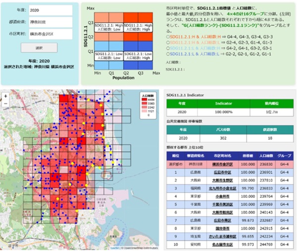 現在、日本の高齢化率は上昇を続けており、将来的に移動手段の確保が困難となる人が増えることが予想されています。そのため公共交通機関の役割は、ますます重要になっていくと考えられています。本研究では、日本の公共交通アクセスの現実を網羅的に把握するため、SDGs(持続可能な開発目標)のゴール11に定められたindicator11.2.1「公共交通機関へ容易にアクセスできる人口の割合(公共交通アクセシビリティ指標)」に着目しました。この指標を算出するために、公的オープンデータを活用し、国土交通省の国土数値情報(鉄道駅・バス停の位置情報)と総務省統計局の国勢調査メッシュ統計を組み合わせた計算方式を開発しました。2010年と2020年のデータを用いて、日本全国47都道府県・1,908市区町村における指標値を算出し、網羅的な比較分析を実施しました。その結果、2010年と比較して2020年の全国平均はIndicator11.2.1の値が低下していることを確認しました。また、指標値による定量的な分析だけでなく、メッシュマップを用いた可視化を通じて、視覚的にも地域ごとの特徴を把握できるWebアプリケーションを開発しました。研究室で開発するメッシュ統計基盤「MESHSTATS for Research*1」上に実装しています。