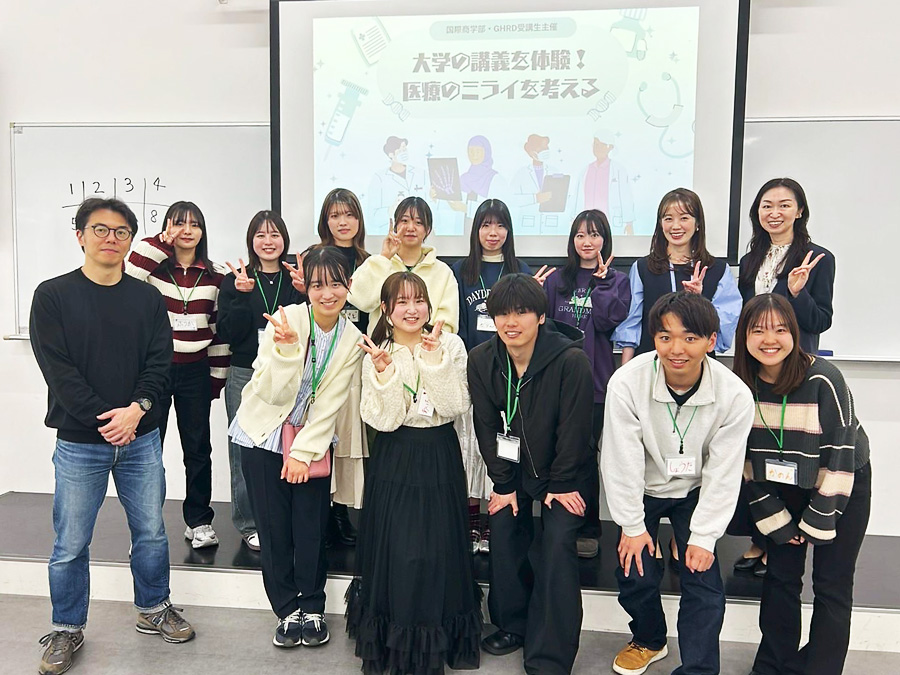 小泉先生(左前列)、企画に参加した学生たち(国際商学部3年)とアステラス製薬の社員(後列右2名)