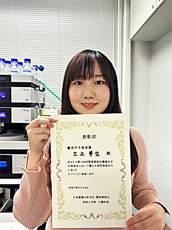 三上さん、優秀学生発表賞受賞おめでとうございます。他分野の方が多数参加される質量分析学会で優秀学生発表賞を受賞されたのは、内容はもちろんのこと、専門分野が異なる研究者をも惹きつける魅力的な発表であったこと、理解しやすいように工夫されたことが理由と思います。これからも三上さんの長所を生かしてご活躍ください。応援しています。