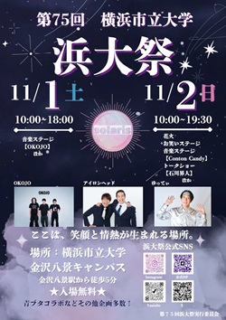 | 第75回浜大祭概要 日時:2025年11月1日(土)10:00~18:00、11月2日(日)10:00~19:30 場所:横浜市立大学金沢八景キャンパス(横浜市金沢区瀬戸22-2) 公式ホームページ:https://75.hamadaisai.info/ ※ 本イベントは入場無料ですが、混雑状況によっては安全確保のため、入場を制限させていただく場合があります。あらかじめご了承ください。 |